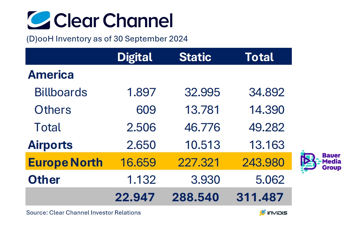 For Clear Channel Outdoor, the process of selling subsidiaries outside the home market has been dragging on for a long time. With the sale of all northern European assets to Germany-based Bauer Media, CCO is parting with 75% of its inventory. 16,659 DooH screens in Northern Europe are changing hands. CCO is left with the small but highly profitable US business and the airport networks.