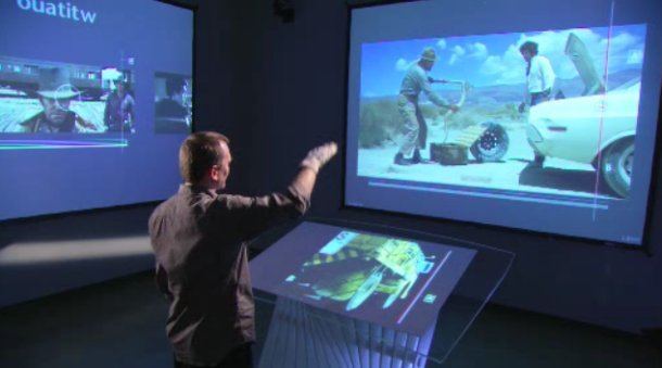 Most of the oh-so-tiresome Minority Report references we hear and read have to do with ad posters reconizing and pitching at Tom Cruise as he’s out in public. Underkoffler and his team at Oblong Industries are behind the other particularly iconic part of that flick, as Cruise puts on a special glove and starts driving a crime and video database seemingly in thin air by usinga waving and pointing hand.