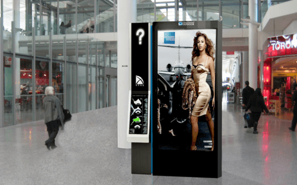 The Digital Advertising and Wayfinding Network (DAWN) is 18 BIG advertising display screens and flanking interactive terminals at Toronto Pearson.