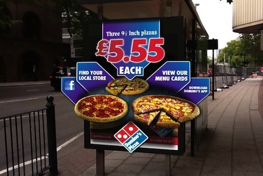 People with smartphones who may hunger for a slap of tomato sauce-slathered cardboard can point their smartphones at outdoor posters and billboards and see a more interactive version of said poster. Through the “experience” you can order a pizza, visit the Facebook page, and download the app.