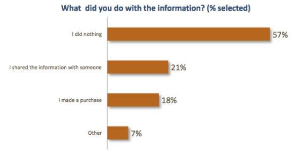 Fifty-seven percent of consumers who have scanned a QR code say they did nothing with the information, compared to 21% who shared the information with someone and 18% who made a purchase, says a survey just released by market research firm Chadwick Martin Bailey.