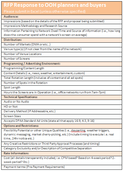 Any digital place-based media seller, network or otherwise, responding with a digital place-based media solution to an OOH planner or buyer should respond with at least the information suggested below. In general, digital place-based media sellers should anticipate the needs of the agency to make a quick and informed decision from the RFP response.