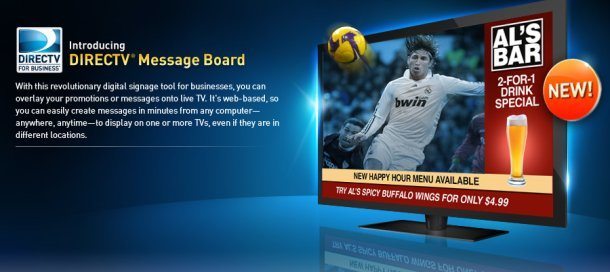 DIRECTV Message Board, says the news release, is an exciting digital signage tool that allows business to overlay promotional messaging on to the live DIRECTV programming they are displaying in their establishment. The product empowers business managers to improve service, and up-sell products while entertaining consumers with premium satellite TV.