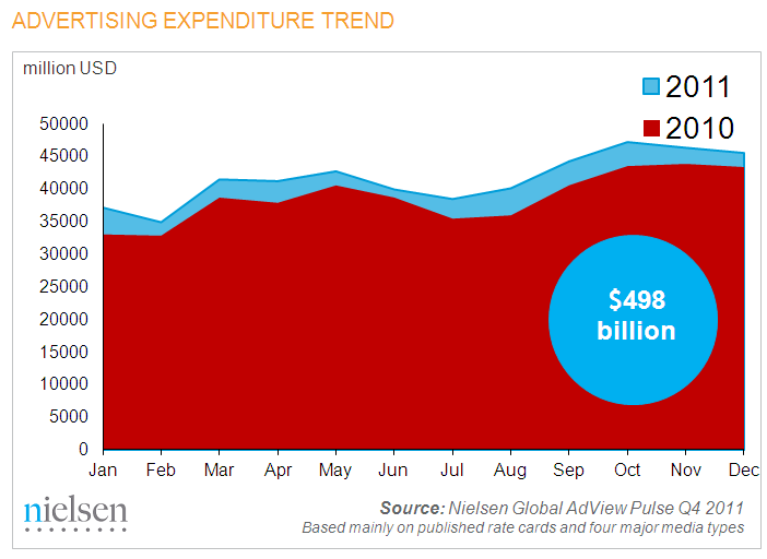 Nielsen said media buying was “impacted by natural disasters, political uprisings, and the ripple effects of financial crises in both the U.S. and Western Europe. After a boost in advertising spending in Q3 2011, many of the world’s biggest advertisers exercised more caution in Q4, but 2011 still showed an overall 7.3 percent increase in spending vs. 2010.”