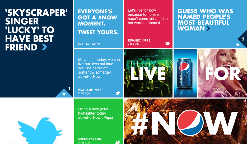 On Pepsi.com tweets tagged with #NOW and #LiveForNow intermingle with a brand-curated experience that will be updated hourly.