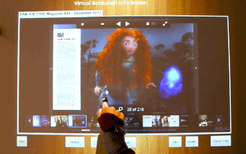 This is intriguing in terms of the possibilities. I don’t see a lot of value in the Kinect-based, gesture-driven things I have seen at trade shows and in demo videos, but the idea of using projection to take a non-interactive surface like a blank wall, tabletop or museum exhibit has some possibilities in terms of reduce costs and the elements of surprise and sheer whimsy (I wasn’t expecting to interact with <blank>).