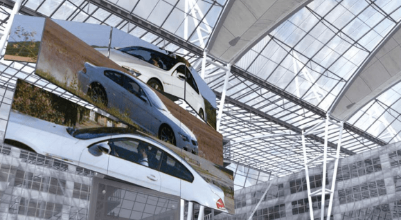 Or, better, I’ll paraphrase what OOH-TV kindly puts in English about this new media tower at Munich’s airport, in what looks like a courtyard area away from all the real bustle. The Meta Twist Tower, as it is known, is three sets of 12 mm pixel pitch LED panels that can pivot and open up to create different visual shapes.