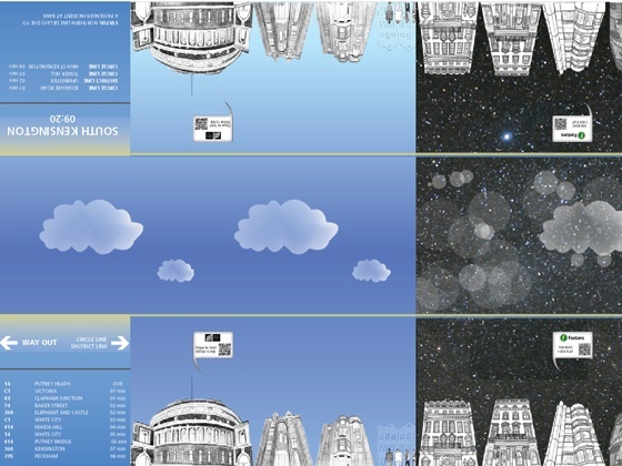 An ‘ambient’ animation of weather conditions and the sky above help provide variation from day-to-day as well as giving information about what is going on above ground. Advertisers can pay for unobtrusive, relevant advertisements and track the effectiveness of their advert; QR codes in the advertisement bubbles are used to track the response rate and charge on a pay-per-click basis.