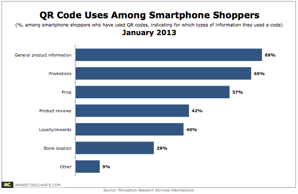 The consumer survey suggested – as relayed in Marketing Charts – among those shoppers who reported having used QR codes, the predominant uses were for general product information (69%) and promotions (65%), with price (57%) also a motivator.