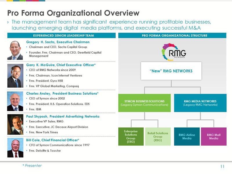 The financials show RMG lost an estimated $11.5 million in 2012, while Symon’s net income was $3.7 million. With a target stock value of $10/share, Symon’s balance sheet makes the new company much more attractive than the wobbly financials of media-driven RMG, which lost a pretty big chunk of change last year.
