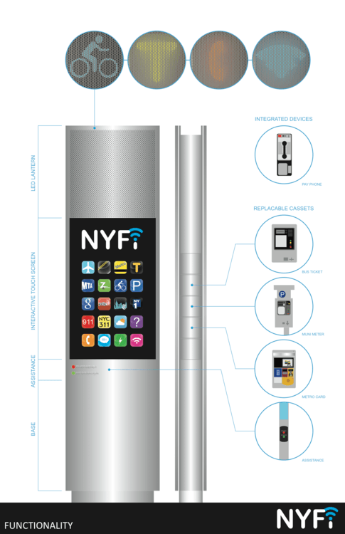 The NYFi features two interfaces and a simple touch activates the height sensitive interactive zone on either face. Two models of the NYFi are proposed: a ten foot model for commercial and manufacturing districts and a smaller model for residential and historic districts where payphones have not traditionally been permitted. When not in use, the default display in commercial areas is interactive advertising and, in residential neighborhoods, way-finding and local interest posts. Its narrow profile minimizes sidewalk obstruction and improves safety and storefront visibility.