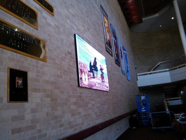 The NanoSlim display’s programming include upcoming show promotions, artist video content, campus-wide events, student and faculty visual art, images of Boise’s landscape and important campus-related information. The display also doubles as a notifier to tell people to get their butts in the seats at the start of shows and as intermissions end. There’s also a live HD video feed so stragglers arriving after curtain time can watch the show until they are allowed in, which is clever.