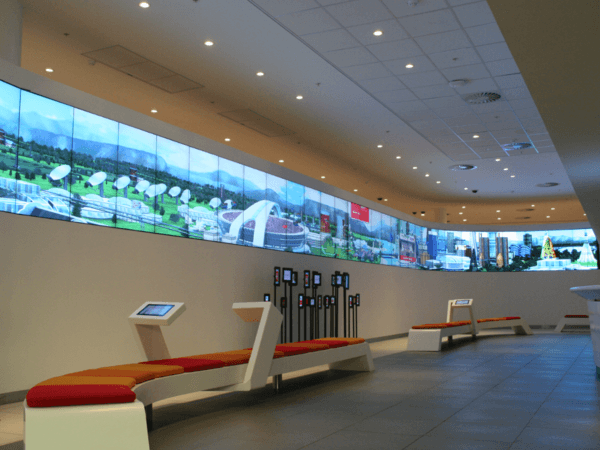There is a big 3 by 3 video wall that has laser scanning to make it interactive. So you walk up to it and navigate like you would a touch screen. Unfortunately, the resolution for the content doesn’t match up with the aggregate pixels of the 3 by 4 metre wall, so it is soft and a little hard to read. Then there’s the simple matter that walking up to a wall-sized screen to navigate something like a kiosk makes very little sense.