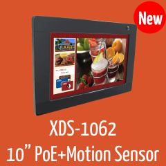 The device further includes a motion sensor, allowing the display to be triggered when a viewer comes into range. A high-res version XDS-1068 with touch screen is also available, as well as an entry-level XDS-1060 without the PoE feature. All three devices feature 300-nit enhanced brightness displays, built-in 2-watt speakers, and standard VESA mount for robust mounting.