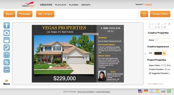NoviSign Digital Signage is a software as a service (SaaS) platform that can, the company says, manage dynamic campaigns from the cloud to any IP-based sign anywhere in the world. From any PC, the user can broadcast the same or different targeted messages to any number of signs at an unlimited number of locations in real-time.