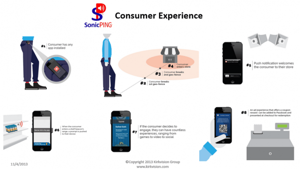 Another key feature is the requirement for the receiving phone to be in emitter range for at 2-3 seconds before it will receive the SonicPING. Put another way, just walking by an emitter will not trigger the mobile engagement, therefore spamming (as experienced with Bluetooth or “small cell push”) is greatly reduced.