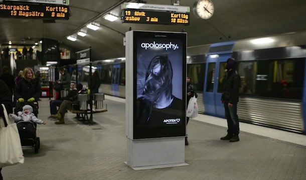 On the platform of a Stockholm subway stop, what looks like a static backlit poster ad for Apotek Hjärtat’s Apolosophy hair care products comes alive when a train comes into the station. The hair on the model in the ad is as windswept as that of the other people on the platform.