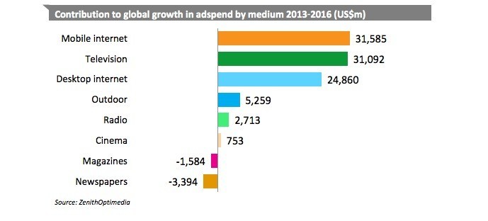 Mobile is now the main driver of global adspend growth. We forecast mobile to contribute 35% of all the extra adspend between 2013 and 2016. Television is the second largest contributor (accounting for 34% of new ad expenditure), followed by desktop internet (27%).