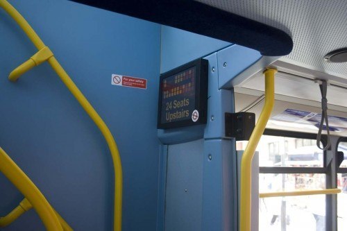 Transport for London in the UK appears to be testing screens on at least one double-decker bus as a means to tell riders whether there are seats on the upper-level, and where the bus is positioned on its route.