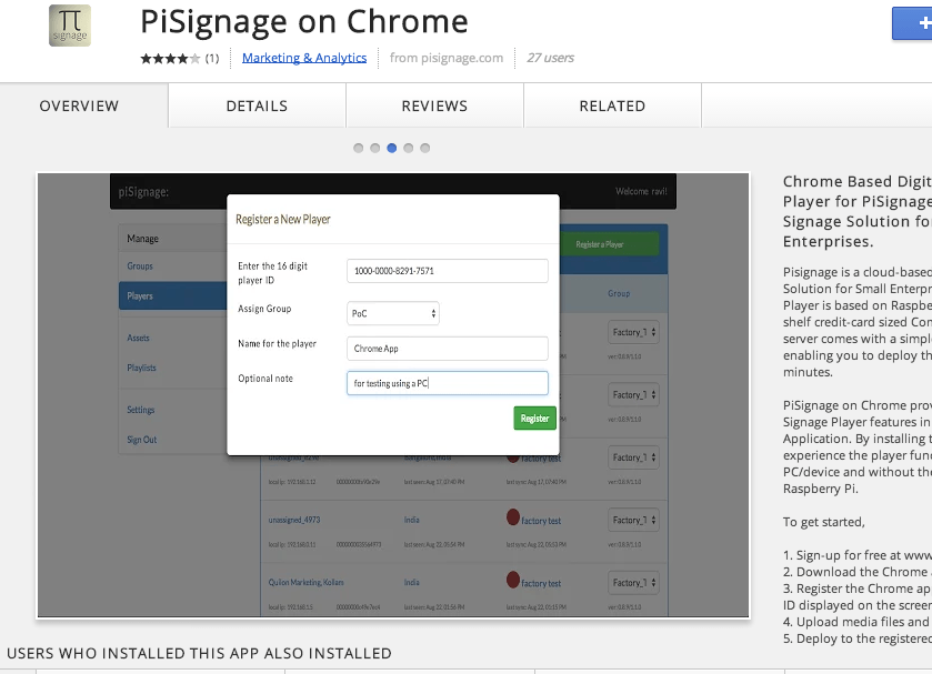 is a cloud-based Digital Signage Solution for Small Enterprises. The Signage Player is based on Raspberry Pi, an off-the-shelf credit-card sized Computer. The Cloud server comes with a simple Admin Panel, enabling you to deploy the solution in minutes. PiSignage on Chrome provides the same Signage Player features in a Chrome Application. By installing the app, you can experience the player functions in your PC/device and without the need for a Raspberry Pi.
