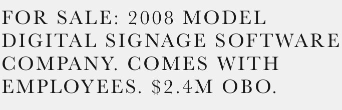 The listing, on something called BizBuySell, describes the business as “a profitable, well-established and highly-strategic digital signage software and hardware vendor. The Company’s capabilities include software design and development, hardware procurement and imaging, content deployment, expert software support, digital sign solution integration and redundant server hosting.