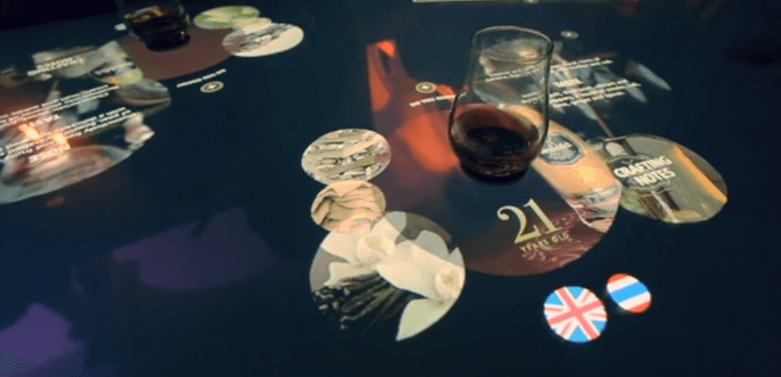 The feature piece is the bar itself, a MultiTaction display from Finland’s MultiTouch. Choose a particular dram of whisky, say a 15-year-old, and put the glass on the interactive bar top, and the tech reads the 2D bar code on the bottom of the glass, opening up information that surrounds the glass.Pretty cool.