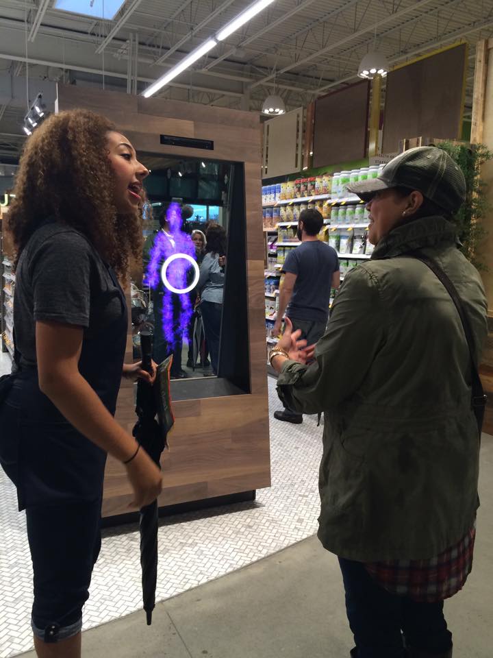 A digital screen on a wall runs an Instagram feed showing produce still growing in the fields of six local farms that supply the store. Elsewhere in the store, a digital mirror encourages shoppers to strike three different poses, which trigger images of recommended health products like vitamins and protein shakes.