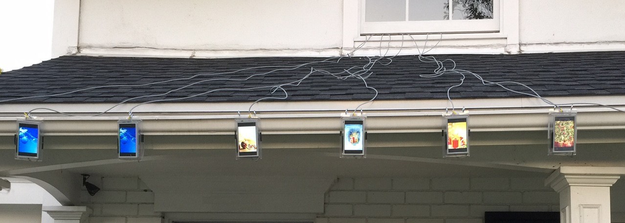 The CEO of a company built on moving a lot new and surplus LCD panels is tinkering around with hanging a row of Sharp 6.5-inch LCDs off the rain gutters of his Southern California house, the content driven by Raspberry Pis at each panel, and another Pi functioning as the server.