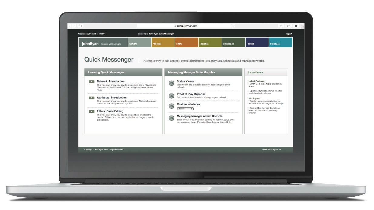 The web-based player works with JohnRyan’s Quick Messenger digital signage content platform.