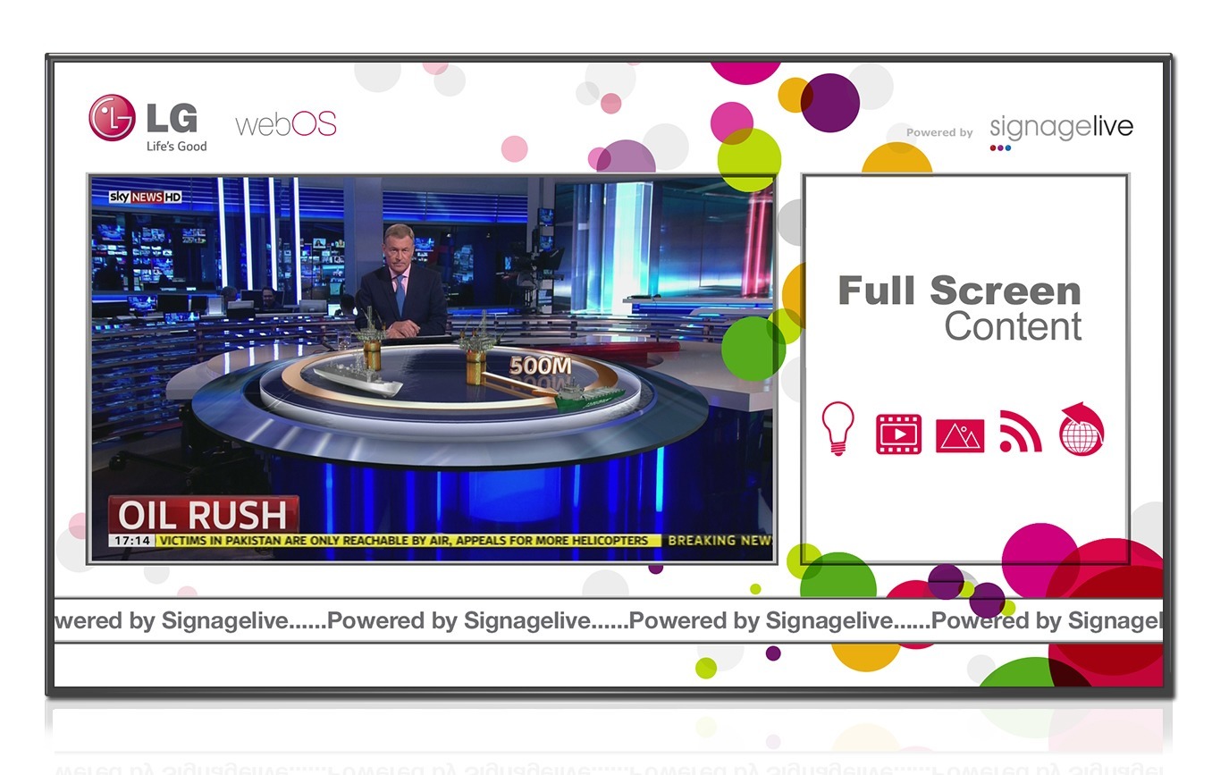 Signagelive has spent the last two years developing a SoC version of its core digital signage technology. Its LG webOS software version is HTML5 based and provides full support for different content formats including static images, video, HDMI inputs, web pages, IPTV, and RSS feeds.