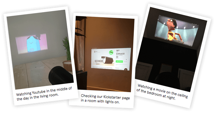 There are a couple of issues, however. First, the resolution is just 854 by 480 – so more standard than high def. And second, the units kick out all of 100 lumens. So in daylight, the projected visuals would be barely visible. Based on some of the other photos on the Kickstarter page, the middle image looks a little iffy.
