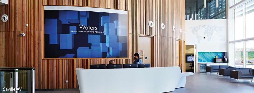 The 3.8 metres x 2.2 metres display wall welcomes Waters visitors in the reception area, and features 48 eyevis omniSHAPES rear projection display modules.