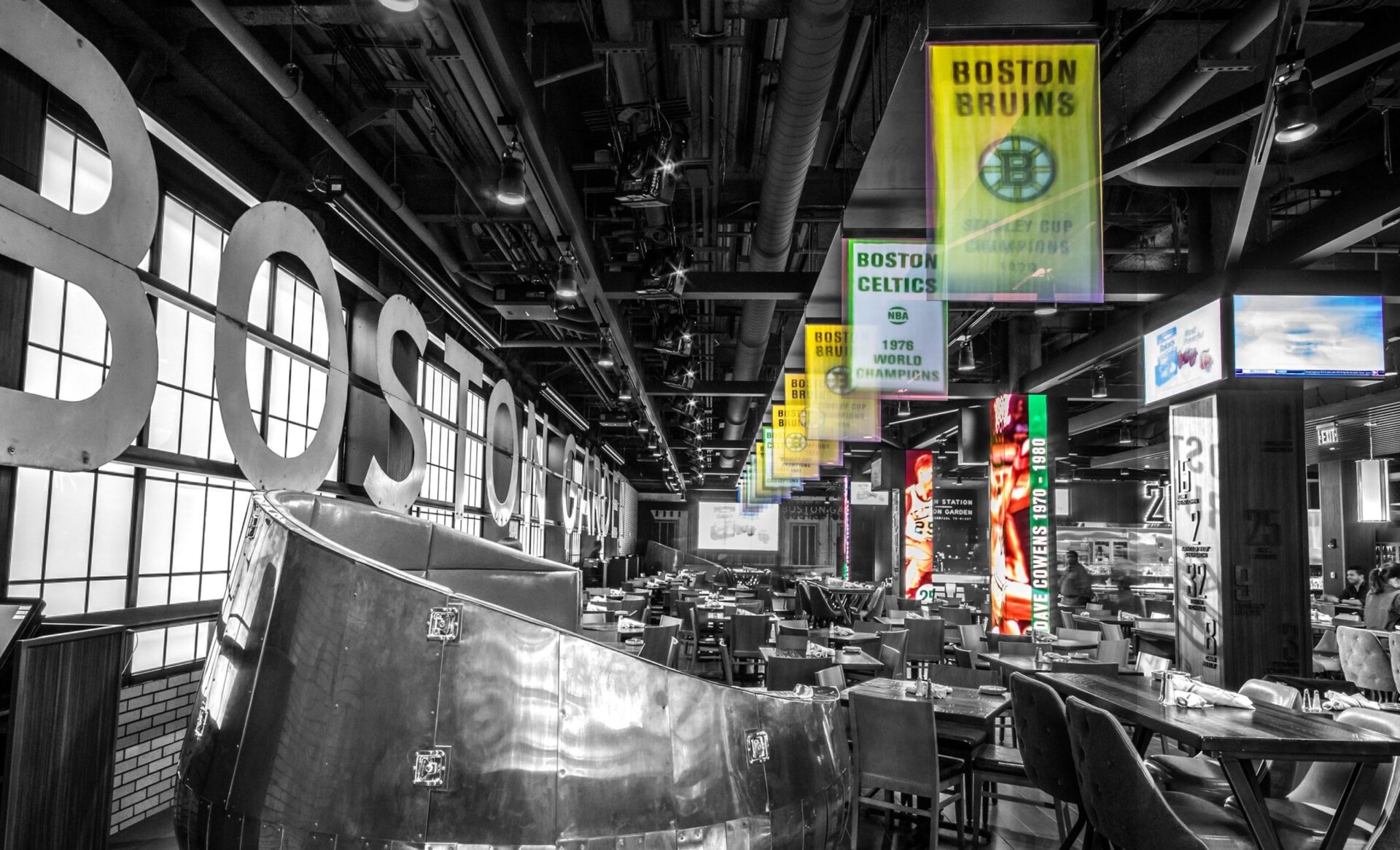 This is not Photoshopped vapor-ware (seen that movie). The displays are already up and running at places like TD Garden in Boston, where the Bruins and Celtics are not playing (out of playoffs). In the pic above, the clear displays are those banners suspended from the bar ceiling, projected on from behind and above. I’d imagine you could some fun things with all those units sync’d.
