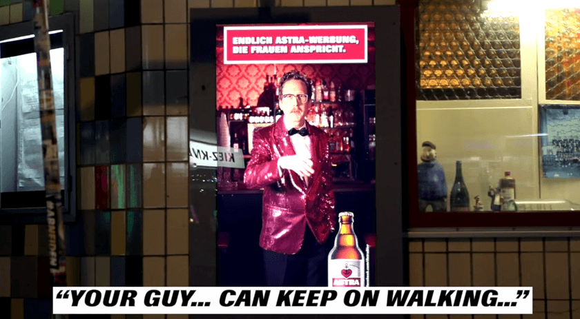 It’s a digital poster campaign for a German brewer, and the campaign is built around trying to market to women, and telling men who stop to have a look to move on. The poster has a camera that provides a feed to a computer that does face pattern detection and, based on machine learning, determines if the face pattern is more likely male or female, and gives a rough age range.