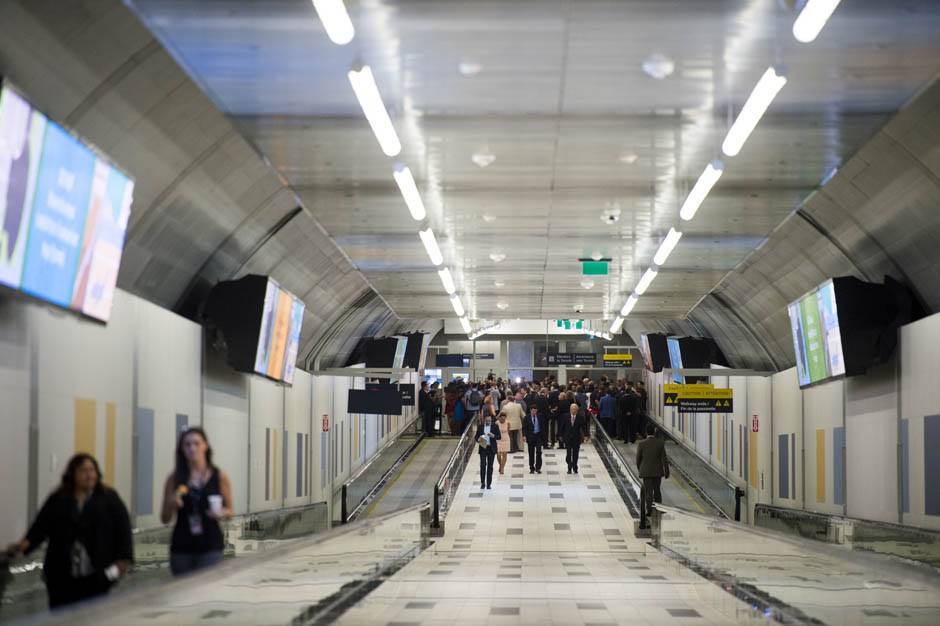 2 – More to the point, who’s looking up and to the sides. You are going somewhere – TO a flight or INTO the city. People are looking ahead. The screens should be in the middle, suspended, where they might actually have an audience and service a purpose. Yes, they’d make the tunnel feel a little more constructed and enclosed, but …