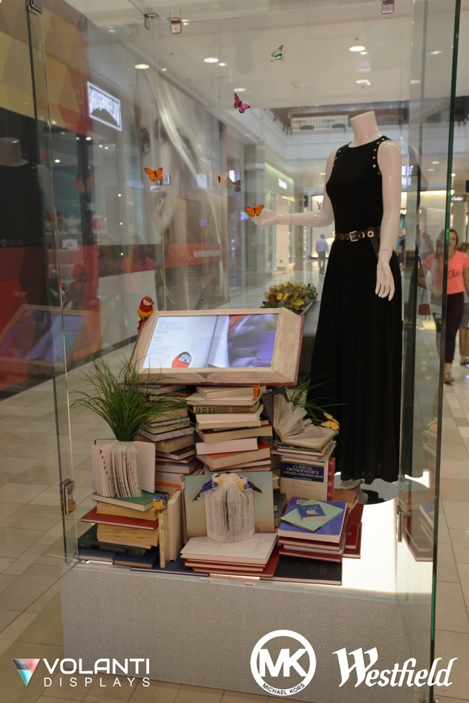 The custom-fabricated display features a mannequin wearing Michael Kors clothing, along with a large video display in a styled book effect enclosure that rests neatly on a pyramid of various books. The book shows the pages of a catalogue as they turn from cover to cover.