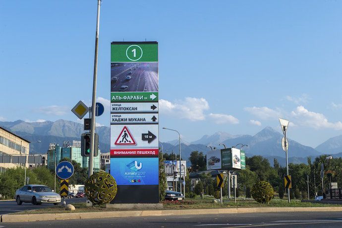 The aim of the project is to instantly inform drivers about the traffic situation in the surrounding streets. Data is being provided through cameras and sensors installed in the direction of traffic. Information is shown in three languages: Kazakh, Russian and English.