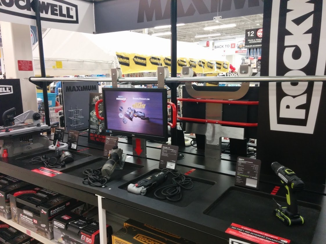 Here’s an interesting digital merchandising set-up I bumped into at my local Canadian Tire store – a big dedicated store within a store zone for the power tool maker Rockwell.