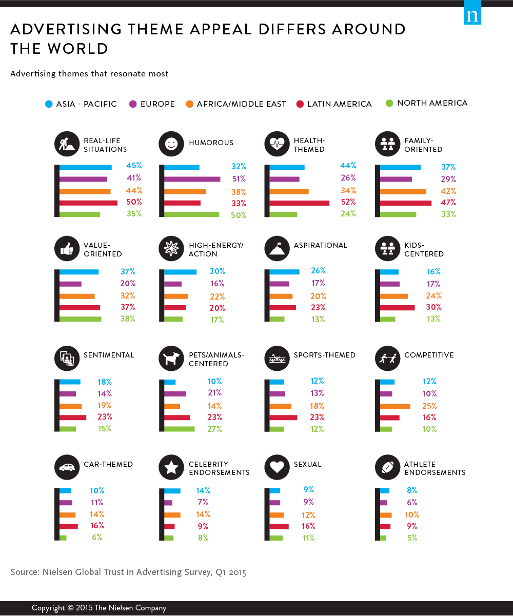 Nielsen’s latest Global Trust in Advertising Survey asked 30,000 online consumers what advertising themes are most impactful, and the results showed the types of messages that resonate most often differ by region and generation.
