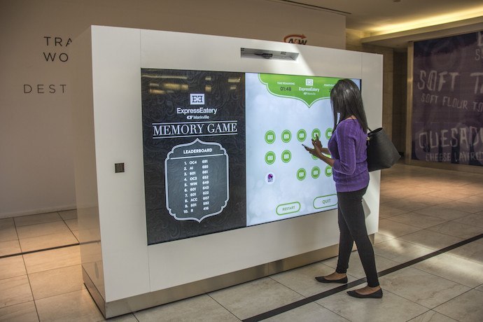- Match by Memory – A two-minute memory challenge that has visitors use the touch screen to flip over as many matching customized cards as possible before the clock runs out. Match by Memory cards have been customized to the logos of the participating tenants located in the Express Eatery.