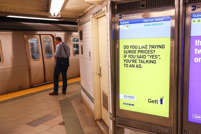 Gett is an on-demand car service building up its user base and competing with Uber, Lift and taxi companies in New York City and elsewhere. The startup is working with the media planning agency Posterscope to get its value proposition out across a variety of screens in Manhattan, notably its fixed pricing on the island (south of 110th) and its no-surge pricing policy.