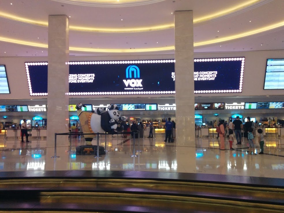 Giorgetti trying out lift and learn, plus touch, atheltic shoe merchandiser Giant LED wall over food concessions in cinema lobby at Mall of Emirates