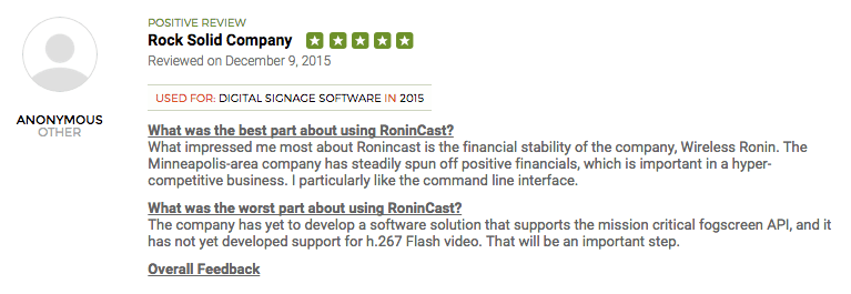 So can signage platforms be credibly reviewed online? I suppose time will tell, but it’s not a reference tool I’d use. The consumer review business can be a swamp consisting heavily of faked reviews and reviews based on being angry or frustrated, as opposed to constructive and insightful write-ups.