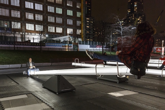 The giant illuminated and sound-producing seesaws are activated by people straddling the seats. Once in motion, the built-in lights and speakers produces a harmonious sequence of sounds and lights.
