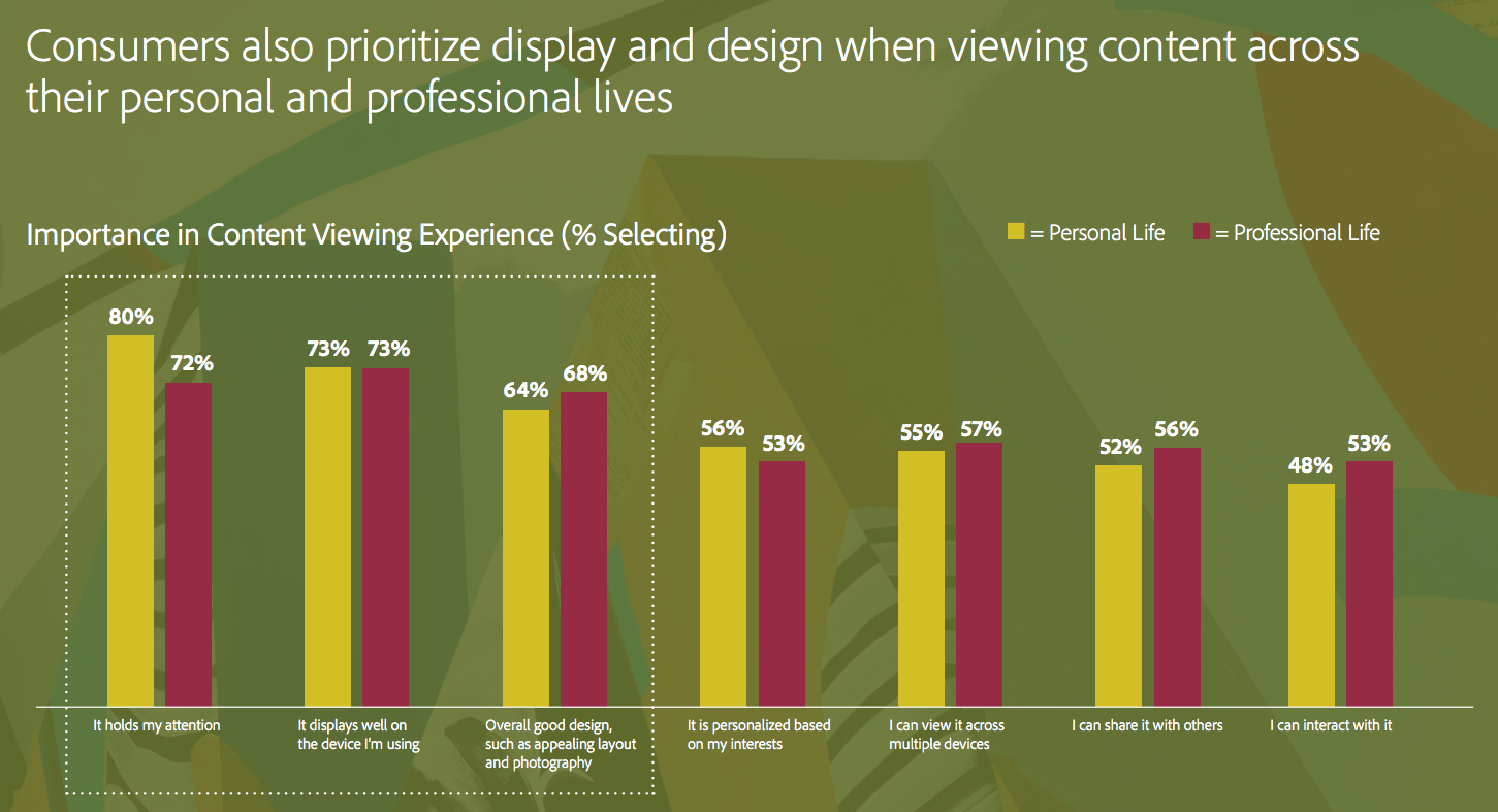 Adobe has been releasing a series of surveys looking at how consumers look at and absorb content, and a recent one – The State of Content: Expectations on the Rise – caught my eye, as it provides some useful insights on the importance of really thinking about the audience and tuning the content to that group, when possible.