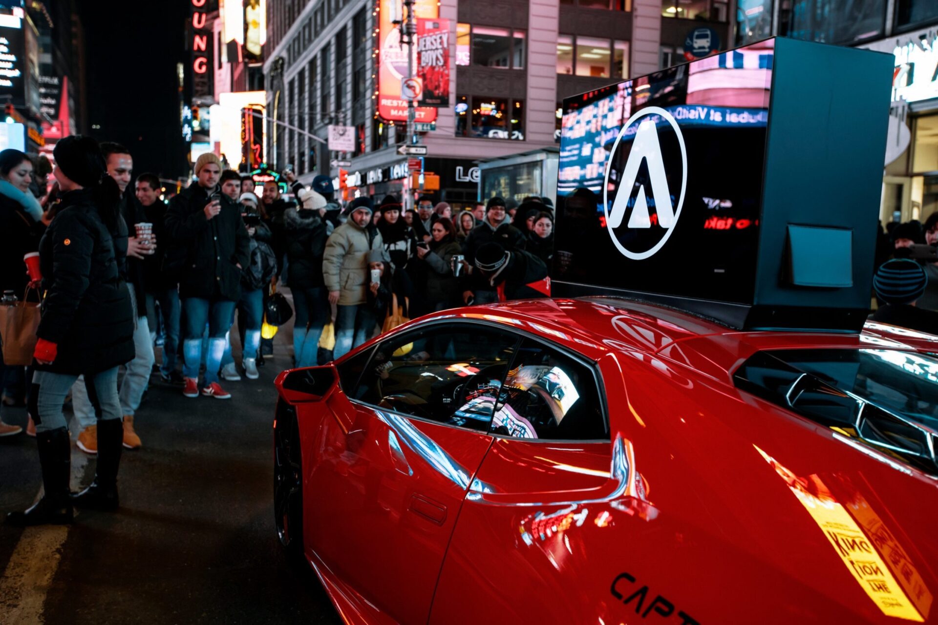 It’s a media company that puts LED video ad screens on top of exotic sports cars, and drives said cars around New York City, building up viewer counts. Think of screens you’ve seen on taxis in some cities – but in this case the rolling stock is a Lamborghini Huracán LP 610-4.