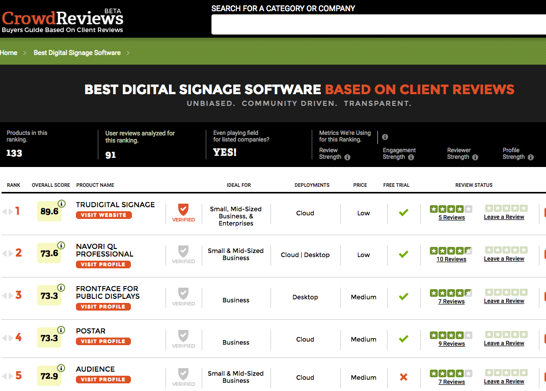 When Google Alerts popped up a press release this morning celebrating “NAVORI QL PROFESSIONAL AWARDED BEST DIGITAL SIGNAGE SOFTWARE ON CROWDREVIEWS.COM,” I was fairly amazed the Navori guys would make hay over an award from a highly dubious crowd-sourced review site.