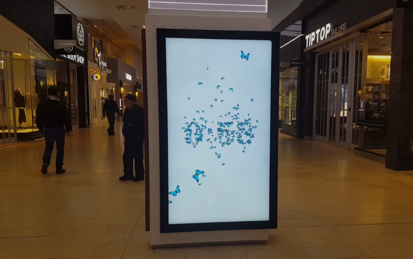 Cineplex Digital Media works with the Toronto mall and its parent company, Oxford Properties, on the digital screens around the various shopping centres aOxford has across the country. To show shoppers the time at Yorkdale, the creative is using an application with dynamic 3D objects that shows a cloud of fluttering butterflies getting themselves organized to show the time of day.