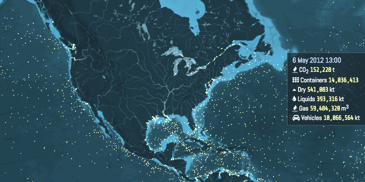 The University of London’s Energy Institute created this great visualization to show the movements of cargo ships, and the resulting carbon footprint. This is just a gif of that. You can (maybe) see the full visualization at http://www.shipmap.org/. You’ll need to enable Web GL support in your browser, which takes a little rooting around to get sorted.