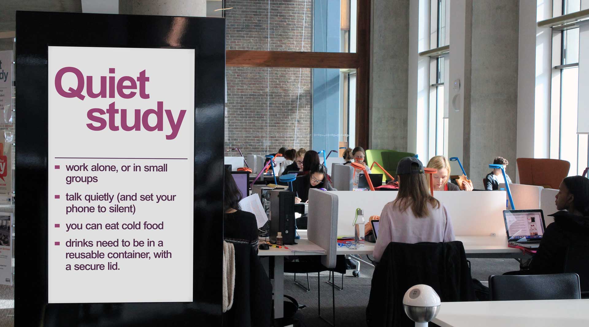 “Navigating around the large 15,000 sq. metre space for up to 9,000 visitors a day can be a challenge,” says Julia Crompton, Marketing Manager, Templeman Library, University of Kent, “so digital signage was employed to aid navigation across the four floors – helping students find a computer to use, books or space to study in. Some screens are also used for room availability and promoting events/services to library users.”